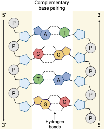 Figure: DNA strands are antiparallel, meaning that one strand goes from the 3’ (three prime) end to 5’ (five prime).